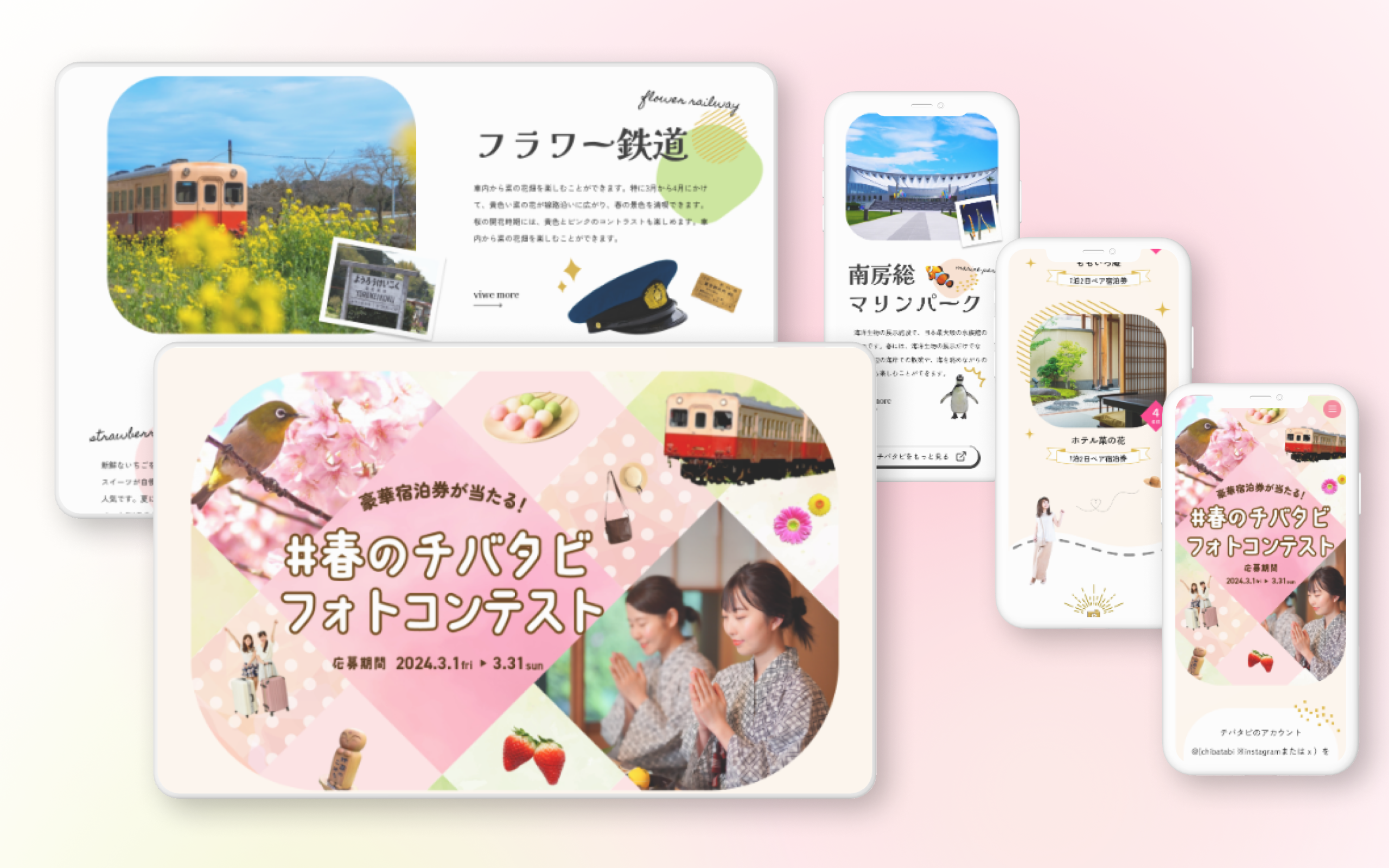 観光情報サイト「チバタビ」のキャンペーンLPをデザインしました。20~30代女性をターゲットに、千葉県の魅力をアピールしつつキャンペーンへの参加を促進することを目的としています。デザイン全体において親しみやすさ、視覚的な楽しさ、そして参加のハードルを低く感じさせる工夫を盛り込んでいます。