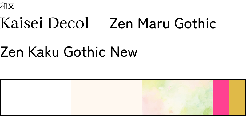 ポイントでKaisei Decolを使用。丸みを帯びた文字形状が特徴的で、キュートな印象・遊び心や親近感を。見出しにはZen Maru Gothicを使い、女性らしさ・親しみやすさを出した。配色ではパステルカラー・特にピンク系にまとめ、アクセントでショッキングピンクとゴールドを使用することで、柔らかく優しい印象や温かみをだしつつ、メリハリのあるデザインを意識した。