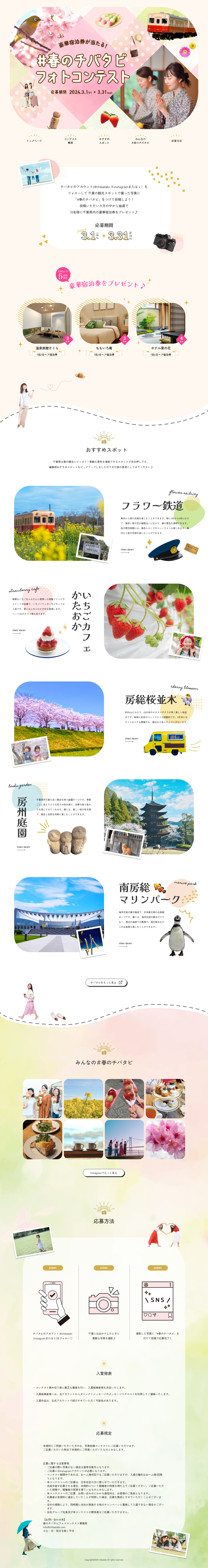 FVでは複数枚の写真を使うことでフォトコンテスト感を演出し、切り抜きやポップな背景でLPの導入からターゲットを引き付けることを意識。HP全体を通して、手書きイラスト・曲線を取り入れた柔らかいシェイプを散りばめ、春らしさと旅行の楽しさを表現。視覚的に楽しく、親しみやすさを感じられ、ターゲットにキャンペーン参加を促進するHPを目指した。