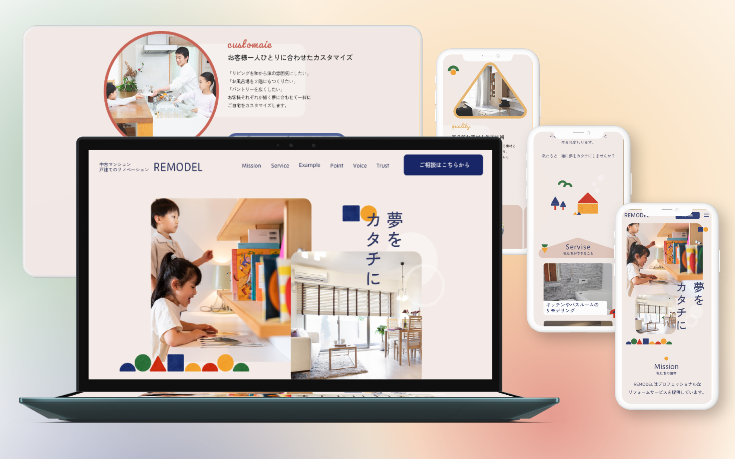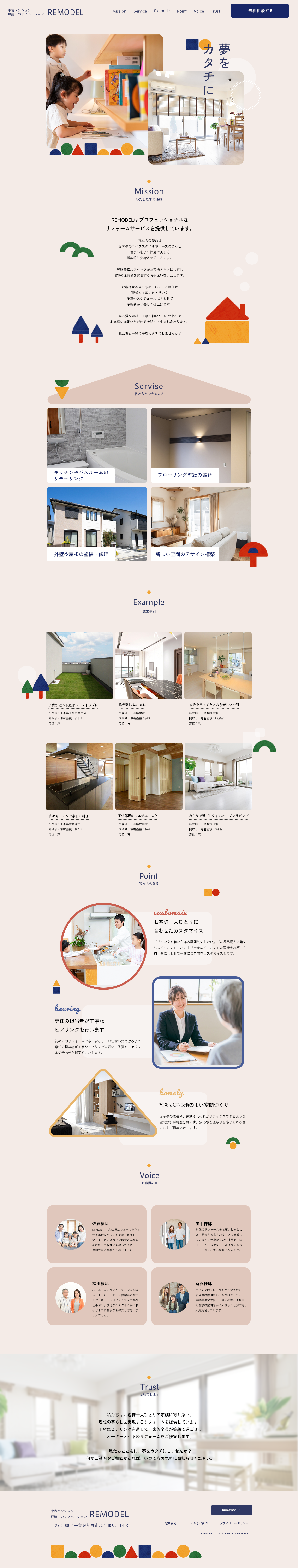 リフォーム会社「REMODEL」のサービス紹介HPのリニューアルデザインです。ターゲットである30~40代のファミリー層に響く親しみやすく、施工実績から実際のリフォームのイメージを想像しやすい信頼感のあるHPを目指しました。