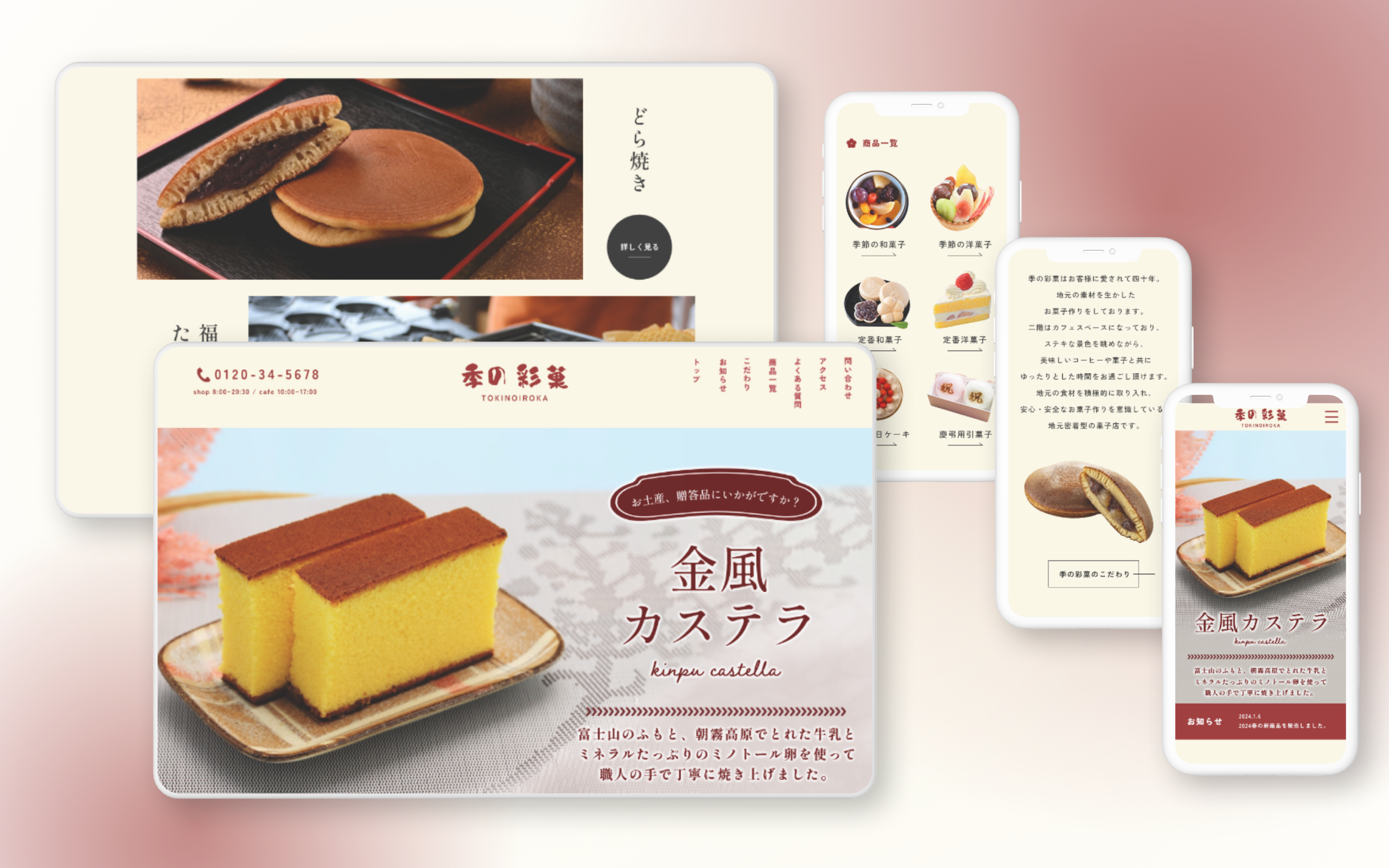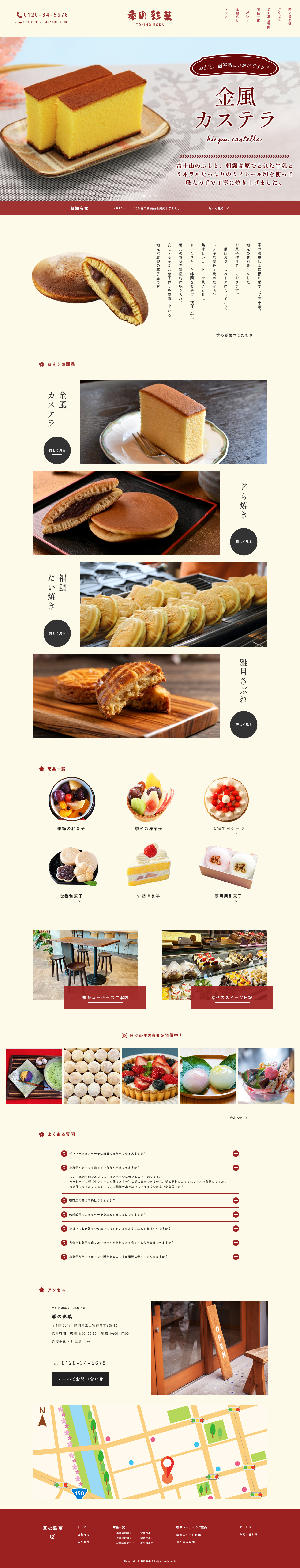 デザインコンセプトは、「地域の魅力と安心感を伝える、柔らかく洗練された和モダン」。ロゴカラーのえんじ色とベージュを基調に、上品でありながらも視認性の高いデザインに。和の雰囲気を醸し出す縦書きやあしらいを使用し、カステラやどら焼きなど定番商品を目立たせるレイアウトで、訪問者が一目で商品の魅力を感じられるサイトを目指した。